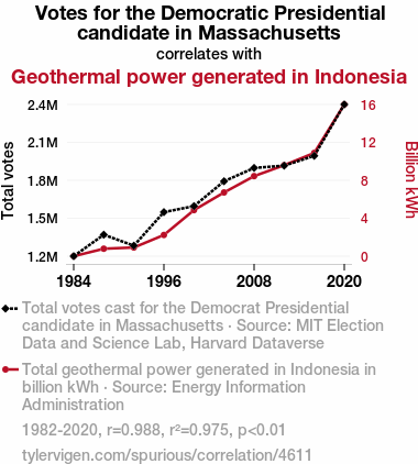 - The spurious research paper: The Democra-Magma Connection: Exploring the Surprising Relationship Between Democratic Vote Share in Massachusetts and Geothermal Power Generation in Indonesia