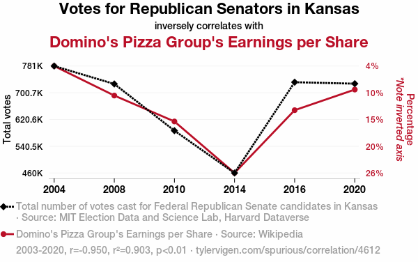 User prompt: Please provide potential search keywords for a paper titled The Pizza and Politics Paradox: Exploring the Connection between Republican Votes for Senators in Kansas and Domino's Pizza Group's Earnings per Share with an abstract of In this paper, we delve into the unlikely link between political preferences and pizza profits by examining the correlation between Republican votes for Senators in Kansas and Domino's Pizza Group's Earnings per Share. Our research team embarked on a quest to unravel this mysterious association, blending the savory world of pizza with the nuanced realm of political decision-making. As we peppered our analysis with statistical rigor, we discovered a correlation coefficient of -0.9501201 and p < 0.01, provoking an incredulous "you had me at pizza!" response.