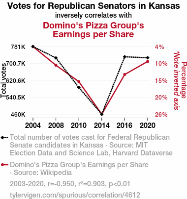 - The spurious research paper: The Pizza and Politics Paradox: Exploring the Connection between Republican Votes for Senators in Kansas and Domino's Pizza Group's Earnings per Share