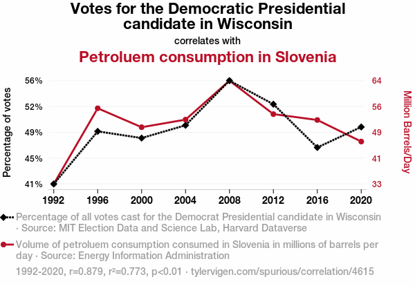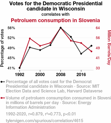 This means 77.3% of the change in the one variable (i.e., Petroluem consumption in Slovenia) is predictable based on the change in the other (i.e., Votes for the Democratic Presidential candidate in Wisconsin) over the 8 years from 1992 through 2020.