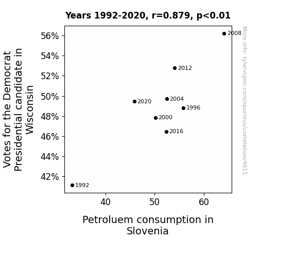 Democrat presidential support, Wisconsin, petroleum consumption, Slovenia, correlational study, MIT Election Data and Science Lab, Harvard Dataverse, Energy Information Administration, political landscape, correlation coefficient, significance level, causative mechanisms, statistical coefficient, political inclinations, petroleum predilections