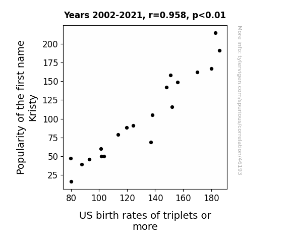 This means 91.8% of the change in the one variable (i.e., US birth rates of triplets or more) is predictable based on the change in the other (i.e., Popularity of the first name Kristy) over the 20 years from 2002 through 2021.