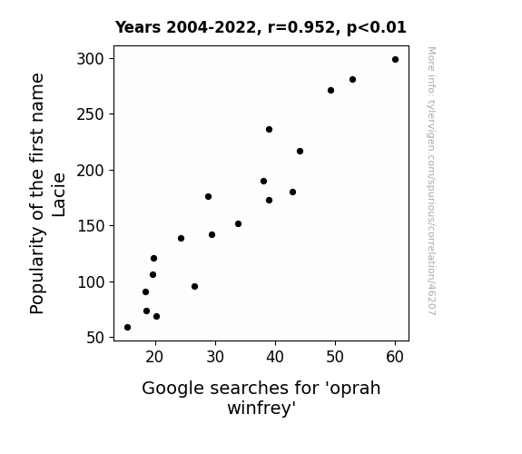 This means 90.5% of the change in the one variable (i.e., Google searches for 'oprah winfrey') is predictable based on the change in the other (i.e., Popularity of the first name Lacie) over the 19 years from 2004 through 2022.