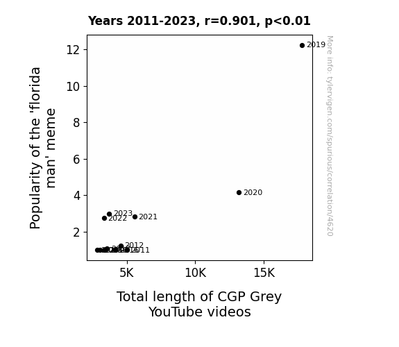 A robust correlation was unveiled between the prevalence of the 'Florida Man' meme and the cumulative length of CGP Grey's intellectual odysseys on YouTube over the period from 2011 to 2023. The correlation coefficient of 0.9005363, with an r-squared value of 0.8109656, indicates a remarkably strong association between these two seemingly unrelated entities. This statistical relationship is further accentuated by the p-value of less than 0.01, lending substantial support to the hypothesis that a connection exists between the 'Florida Man' phenomenon and the aural banquets served by CGP Grey on the digital stage.