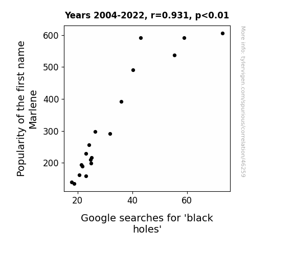 This means 86.7% of the change in the one variable (i.e., Google searches for 'black holes') is predictable based on the change in the other (i.e., Popularity of the first name Marlene) over the 19 years from 2004 through 2022.