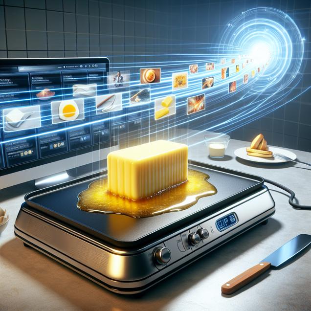 User prompt: Please respond with an image generation prompt that would be likely to create an interesting visual using DALLE-3, using the following style: [ Futuristic ] and depicting this scene: Imagine a scene where a large stick of butter is melting on a hot griddle, sizzling and slowly liquefying. As the butter melts, it flows and expands, covering the entire surface with a smooth, golden layer. Meanwhile, in the background, a computer screen displays a playlist of Mark Rober's YouTube videos, each with a longer duration than the last, playing continuously. The butter and the videos, both increasing in volume and length, seem to mirror each other in their gradual growth. Keep the visual depiction simple. Do not include any words or speech bubbles.