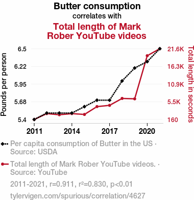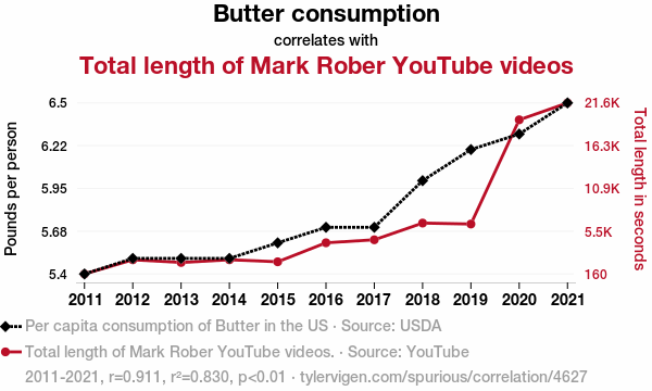 This means 83% of the change in the one variable (i.e., Total length of Mark Rober YouTube videos) is predictable based on the change in the other (i.e., Butter consumption) over the 11 years from 2011 through 2021.