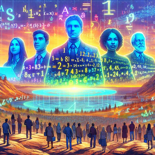 Prompt: Generate an image of the Utah landscape with a group of vividly colored, larger-than-life actuaries towering over it. Each actuary confidently solves mathematical equations projected around them, while bright numbers soar above, merging with the vibrant sky. In the background, a mesmerized crowd of residents gazes up in awe, captivated by the spectacle of the mathematicians' collective brainpower. Amidst this, the YouTube channel Numberphile's logo transforms into a dynamic, eye-catching pop art style, mirroring the exponential growth of their video titles. The depiction should include only scenes, people, and objects, it should not include text or speech bubbles.