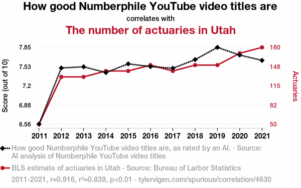 User prompt: Please make up a funny explanation for how an increase in How good Numberphile YouTube video titles are caused The number of actuaries in Utah to increase. Make it feel plausible.