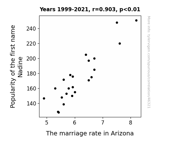 This means 81.6% of the change in the one variable (i.e., The marriage rate in Arizona) is predictable based on the change in the other (i.e., Popularity of the first name Nadine) over the 23 years from 1999 through 2021.