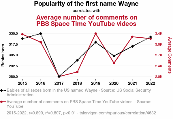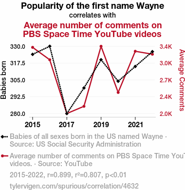 This means 80.7% of the change in the one variable (i.e., Average number of comments on PBS Space Time YouTube videos) is predictable based on the change in the other (i.e., Popularity of the first name Wayne) over the 8 years from 2015 through 2022.