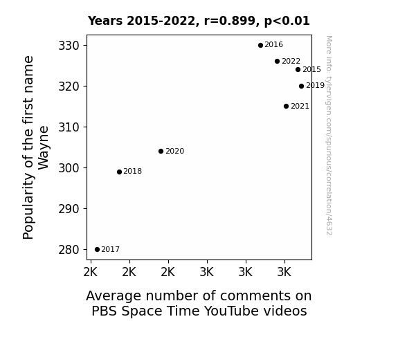 User prompt: Please provide potential search keywords for a paper titled Wayne's World: The Cosmic Connection Between Name Popularity and YouTube Engagement with an abstract of This study delves into the curious relationship between the popularity of the first name "Wayne" and the average number of comments on PBS Space Time YouTube videos. Leveraging data from the US Social Security Administration and YouTube, our research team sought to shed light on this peculiar correlation. Our findings reveal a significant positive correlation coefficient of 0.8985079 with p < 0.01, covering the period from 2015 to 2022.
