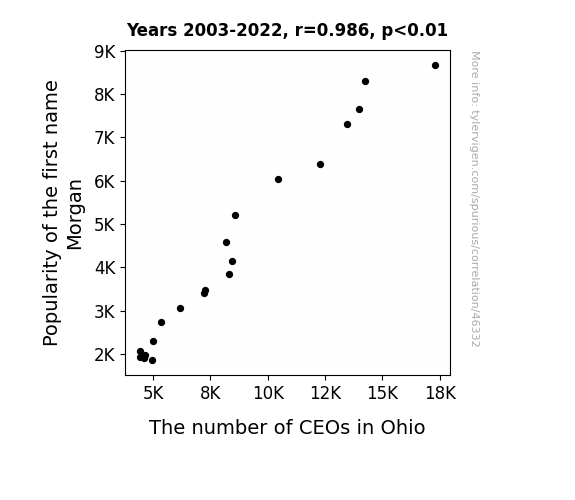 This means 97.3% of the change in the one variable (i.e., The number of CEOs in Ohio) is predictable based on the change in the other (i.e., Popularity of the first name Morgan) over the 20 years from 2003 through 2022.