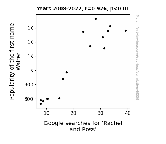 This means 85.8% of the change in the one variable (i.e., Google searches for 'Rachel and Ross') is predictable based on the change in the other (i.e., Popularity of the first name Walter) over the 15 years from 2008 through 2022.