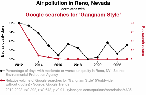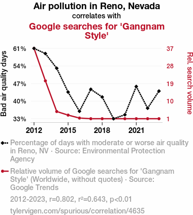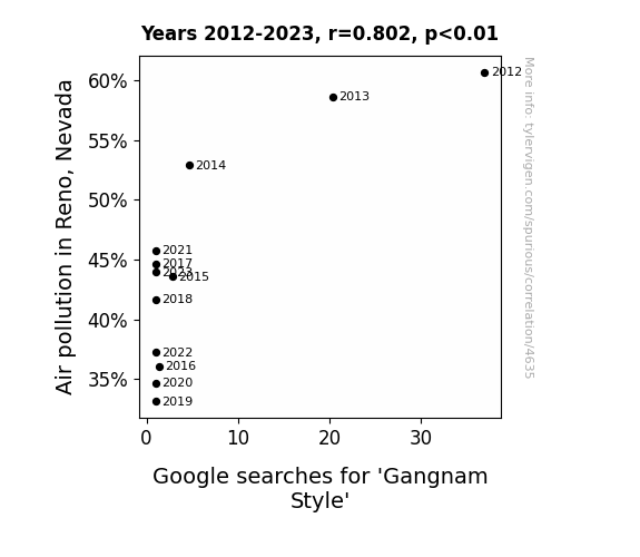 This means 64.3% of the change in the one variable (i.e., Google searches for 'Gangnam Style') is predictable based on the change in the other (i.e., Air pollution in Reno, Nevada) over the 12 years from 2012 through 2023.