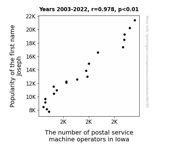 This means 95.6% of the change in the one variable (i.e., The number of postal service machine operators in Iowa) is predictable based on the change in the other (i.e., Popularity of the first name Joseph) over the 20 years from 2003 through 2022.