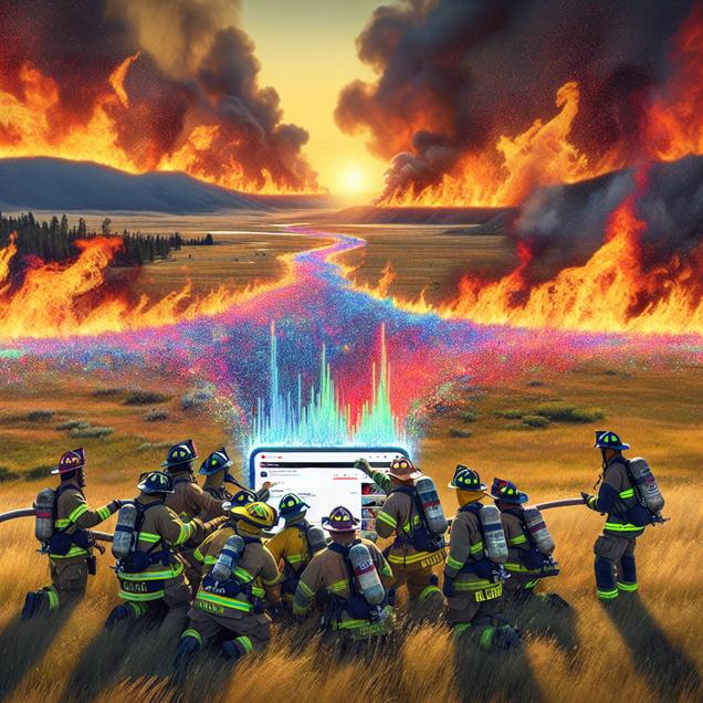 ChatGPT: Generate a visualization of a South Dakota landscape engulfed in flames, with firefighters bravely battling the arson. Amidst the chaos, depict a group of firefighters finding respite as they huddle around a screen filled with colorful and mesmerizing visuals of Vihart's YouTube videos. Show a parallel between the surge in total likes for Vihart's content and the firefighters' determined efforts to douse the flames, demonstrating a unique connection between combating fire and fueling the online success of captivating math and music videos.
