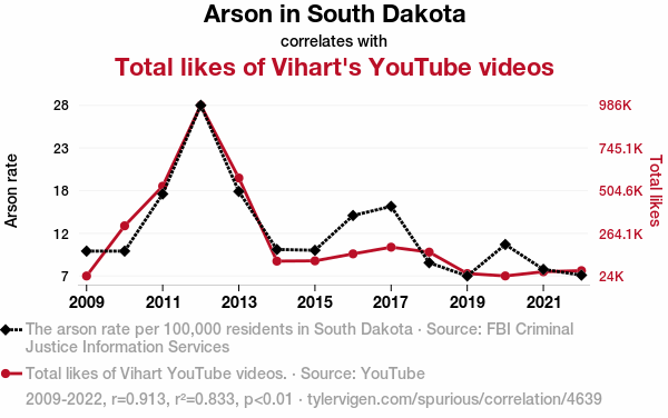 - The spurious research paper: Playing with Fire: An Unlikely Connection Between Arson in South Dakota and the Total Likes of Vihart YouTube Videos