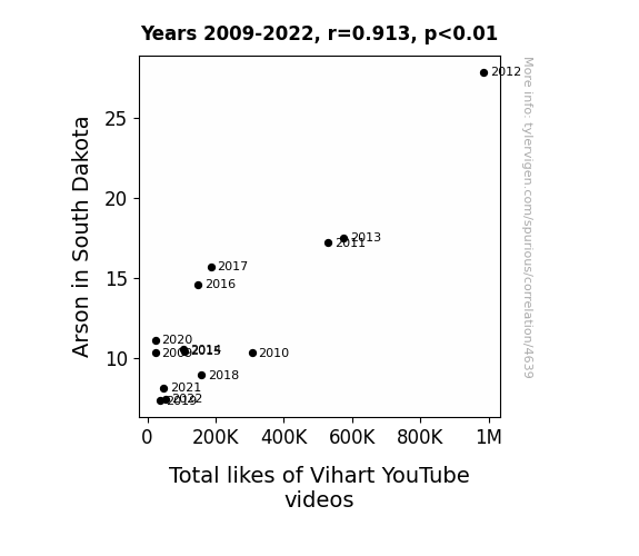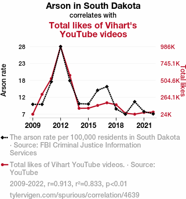 User prompt: Please provide potential search keywords for a paper titled Playing with Fire: An Unlikely Connection Between Arson in South Dakota and the Total Likes of Vihart YouTube Videos with an abstract of In this study, we set out to explore the surprising and seemingly inexplicable relationship between arson rates in South Dakota and the total likes garnered by Vihart's YouTube videos. Utilizing data from the FBI Criminal Justice Information Services and YouTube analytics, we delved into a seemingly improbable correlation that turned heads and raised eyebrows. Our research team applied rigorous statistical analysis and discovered a strikingly high correlation coefficient of 0.9125852, with a p-value of less than 0.01, for the time period spanning 2009 to 2022. Despite expectations of a mere flicker of a link, our findings revealed a burning connection between the two seemingly unrelated phenomena.