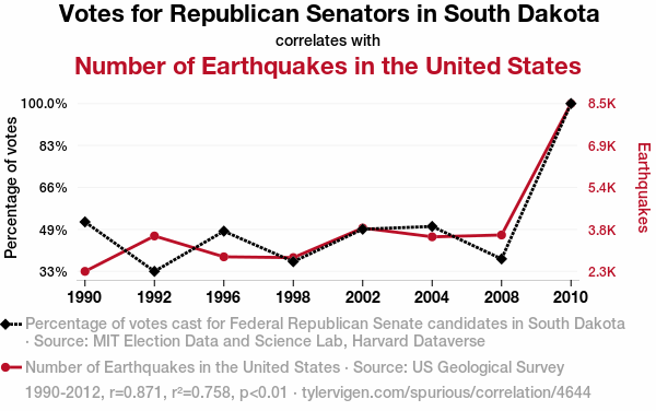 - The spurious research paper: Shakin' Up the Ballot Box: The Correlation Between Republican Votes for Senators in South Dakota and Seismic Activity in the United States