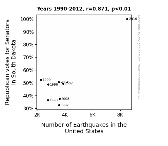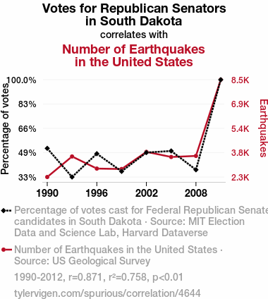 User prompt: Please provide potential search keywords for a paper titled Shakin' Up the Ballot Box: The Correlation Between Republican Votes for Senators in South Dakota and Seismic Activity in the United States with an abstract of The present study aimed to investigate the relationship between Republican votes for Senators in South Dakota and the number of earthquakes in the United States. Leveraging data from the MIT Election Data and Science Lab, Harvard Dataverse, and the US Geological Survey, a thorough analysis was conducted to shed light on this surprising association. The findings revealed a substantial correlation coefficient of 0.8709042 and p < 0.01 for the period from 1990 to 2012.