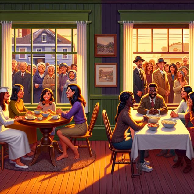 Prompt: An image that looks like it is a scene from a Pixar movie]: In the heart of a cozy living room, a group of graduates with Bachelor's degrees in Family and Consumer Sciences/Human Sciences are animatedly gathered around a warm, wooden table, deep in discussion. Each character exudes passion and knowledge, embodying the essence of household management techniques. Their vibrant expressions hint at a shared understanding and enthusiasm for their field. Through the window, the outside world comes to life with a line of people patiently waiting to cast their votes for the Libertarian Presidential candidate in Montana. The scene outside is filled with hope, determination, and a wave of change, beautifully contrasting with the warmth of the interior setting. The visual subtly highlights the impact of home economics education on the graduates' perspectives, adding depth and complexity to the vibrant world of the Pixar-like scene. The depiction should include only scenes, people, and objects, it should not include text or speech bubbles.