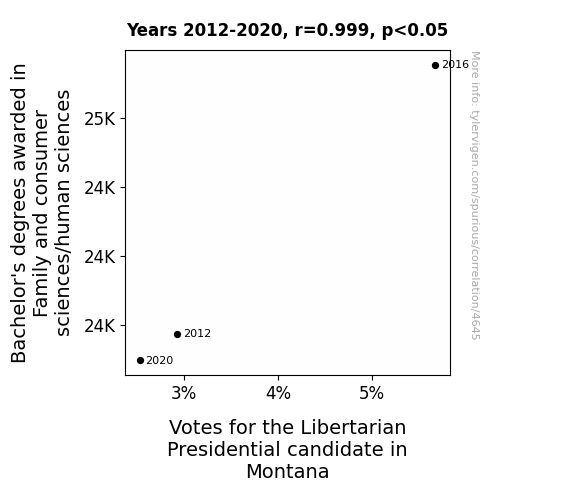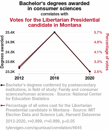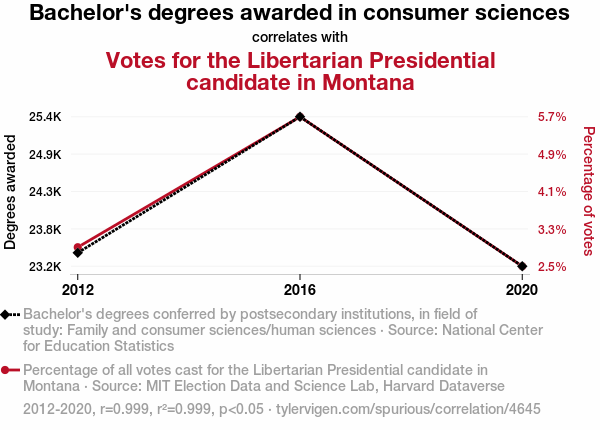User prompt: Please provide potential search keywords for a paper titled Consumer Science Credentials: A Libertarian Lean in Montana? with an abstract of This study investigates the correlation between the number of Bachelor's degrees awarded in consumer sciences and votes for the Libertarian presidential candidate in the state of Montana. Utilizing data from the National Center for Education Statistics and the MIT Election Data and Science Lab at Harvard Dataverse, a rigorous statistical analysis was performed. The findings reveal a remarkably strong correlation coefficient of 0.9993683 and a significant p-value of less than 0.05 from 2012 to 2020. The implications of this association for consumer science education and political preferences in the Big Sky Country are discussed, shedding light on the fascinating interplay between academic pursuits and electoral inclinations.
