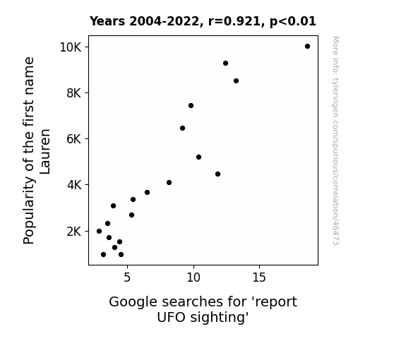 This means 84.7% of the change in the one variable (i.e., Google searches for 'report UFO sighting') is predictable based on the change in the other (i.e., Popularity of the first name Lauren) over the 19 years from 2004 through 2022.
