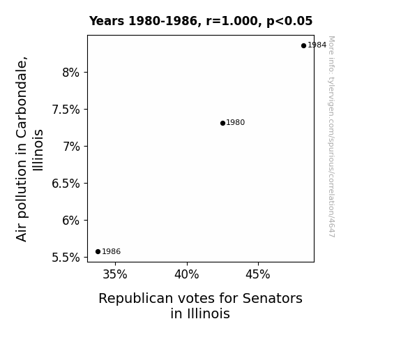 This means 100% of the change in the one variable (i.e., Votes for Republican Senators in Illinois) is predictable based on the change in the other (i.e., Air pollution in Carbondale, Illinois) over the 3 years from 1980 through 1986.