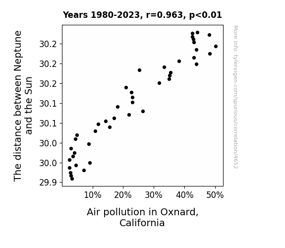 This means 92.8% of the change in the one variable (i.e., Air pollution in Oxnard, California) is predictable based on the change in the other (i.e., The distance between Neptune and the Sun) over the 44 years from 1980 through 2023.