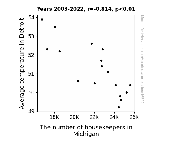 This means 66.2% of the change in the one variable (i.e., The number of housekeepers in Michigan) is predictable based on the change in the other (i.e., Average temperature in Detroit) over the 17 years from 2003 through 2022.