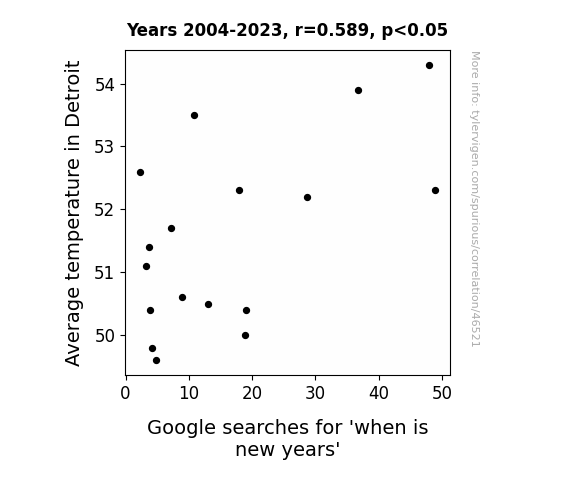 This means 34.7% of the change in the one variable (i.e., Google searches for 'when is new years') is predictable based on the change in the other (i.e., Average temperature in Detroit) over the 17 years from 2004 through 2023.