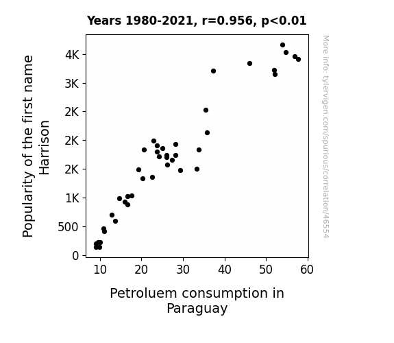 This means 91.4% of the change in the one variable (i.e., Petroluem consumption in Paraguay) is predictable based on the change in the other (i.e., Popularity of the first name Harrison) over the 42 years from 1980 through 2021.