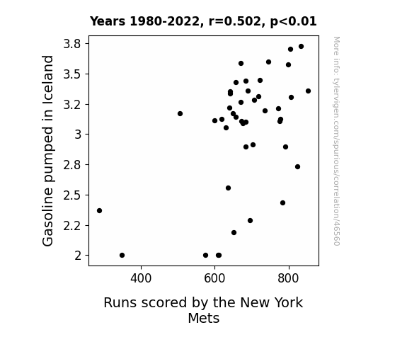Every gallon of gasoline pumped in Iceland adds a tiny bit of extra heat to the earth's atmosphere. This leads to a slightly higher average temperature in New York, creating the perfect balmy weather for the Mets to hit more home runs and score more runs overall. It's like an unintentional, trans-Atlantic heat wave power-up for the Mets!Discover a new correlation