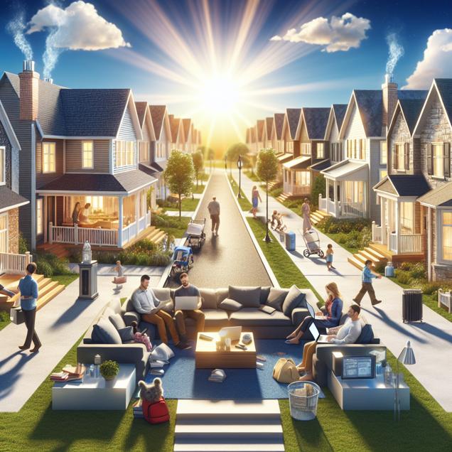 Prompt: Image Generation Prompt: Generate a photo-realistic image depicting a serene neighborhood in Greenwood, South Carolina. The scene should feature clear blue skies overhead and neatly lined streets showcasing charming homes. The air quality should be pristine, with every detail of the homes visible. Inside the homes, residents are shown on their laptops, surrounded by immaculately clean interiors. The sun should filter through the windows, casting a bright light on the gleaming surfaces, showcasing the impact of the clean air on the home interiors. The depiction should include only scenes, people, and objects, it should not include text or speech bubbles.