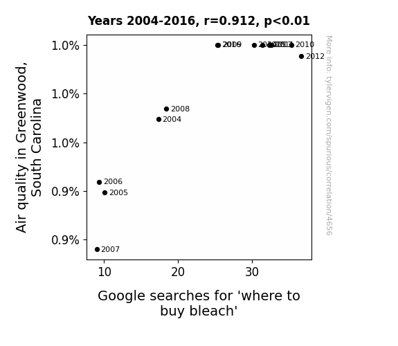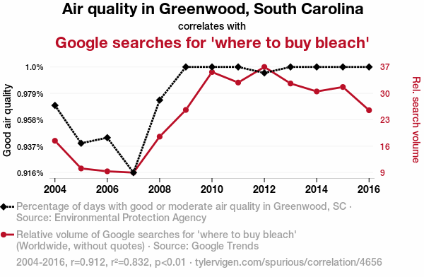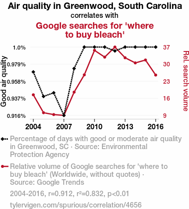 - The spurious research paper: Clearing the Air: The Bleach-iful Relationship Between Air Quality in Greenwood, South Carolina and Google Searches for 'Where to Buy Bleach'