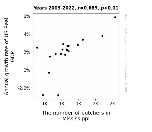 This means 47.5% of the change in the one variable (i.e., The number of butchers in Mississippi) is predictable based on the change in the other (i.e., Annual growth rate of US Real GDP) over the 20 years from 2003 through 2022.