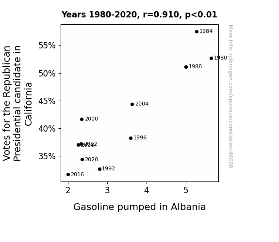 This means 82.8% of the change in the one variable (i.e., Gasoline pumped in Albania) is predictable based on the change in the other (i.e., Votes for the Republican Presidential candidate in California) over the 11 years from 1980 through 2020.