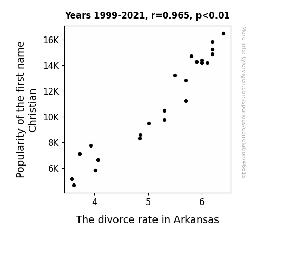 This means 93.1% of the change in the one variable (i.e., The divorce rate in Arkansas) is predictable based on the change in the other (i.e., Popularity of the first name Christian) over the 23 years from 1999 through 2021.
