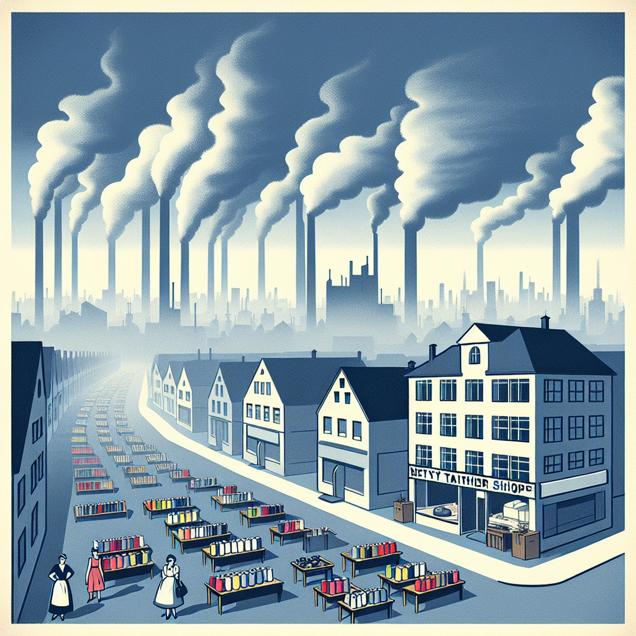Prompt: Generate an image inspired by bauhaus depicting a scene in Vineland, New Jersey, where the clear blue sky is marred by smog, indicating high levels of air pollution. In stark contrast, there is a quaint tailor shop with few customers, and empty spools of thread and neatly organized bolts of fabric revealing the decline in demand for custom tailoring services. Capture the juxtaposition of the pollution in the sky against the overlooked tailor shop in a minimalist, yet impactful way. The depiction should include only scenes, people, and objects, it should not include text or speech bubbles.