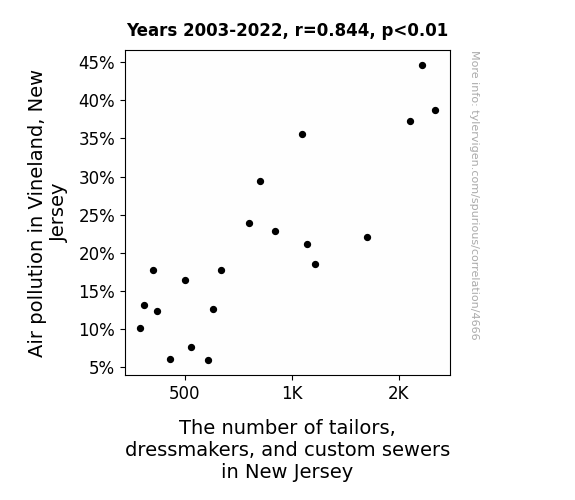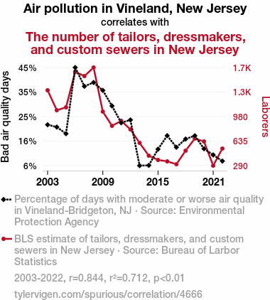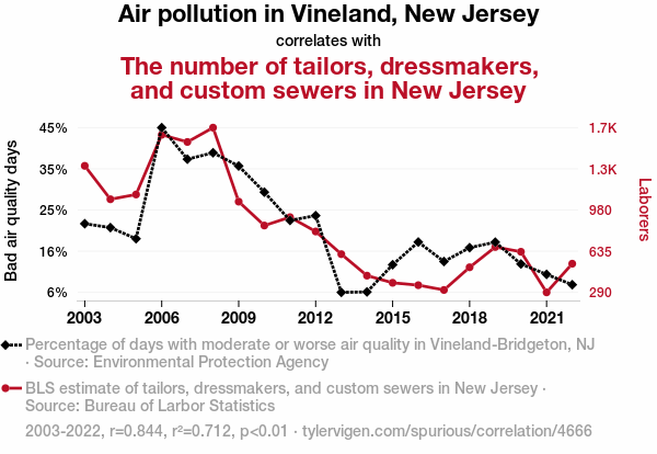 - The spurious research paper: Sewing Through the Smog: The Stitching Connection Between Air Pollution in Vineland, New Jersey and the Number of Tailors, Dressmakers, and Custom Sewers in New Jersey