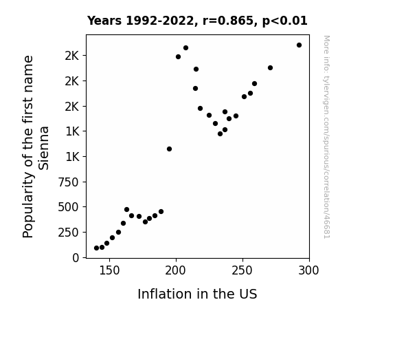 This means 74.8% of the change in the one variable (i.e., Inflation in the US) is predictable based on the change in the other (i.e., Popularity of the first name Sienna) over the 31 years from 1992 through 2022.