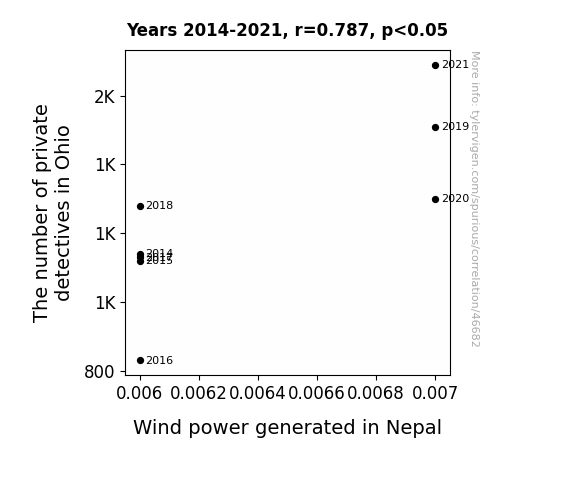 This means 61.9% of the change in the one variable (i.e., Wind power generated in Nepal) is predictable based on the change in the other (i.e., The number of private detectives in Ohio) over the 8 years from 2014 through 2021.