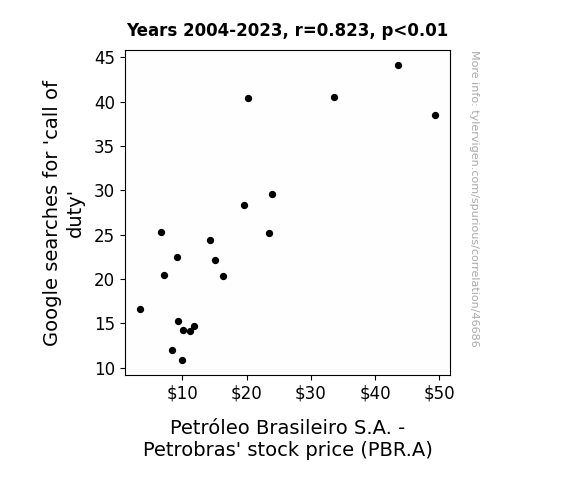 This means 67.7% of the change in the one variable (i.e., Petróleo Brasileiro S.A. - Petrobras' stock price (PBR.A)) is predictable based on the change in the other (i.e., Google searches for 'call of duty') over the 20 years from 2004 through 2023.