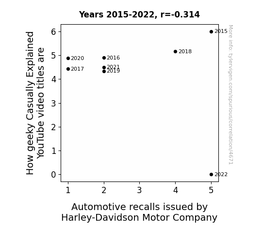 User prompt: Please make up a funny explanation for how a decrease in How geeky Casually Explained YouTube video titles are caused Automotive recalls issued by Harley-Davidson Motor Company to increase. Include one good pun.