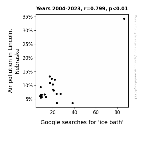 This means 63.8% of the change in the one variable (i.e., Google searches for 'ice bath') is predictable based on the change in the other (i.e., Air pollution in Lincoln, Nebraska) over the 20 years from 2004 through 2023.