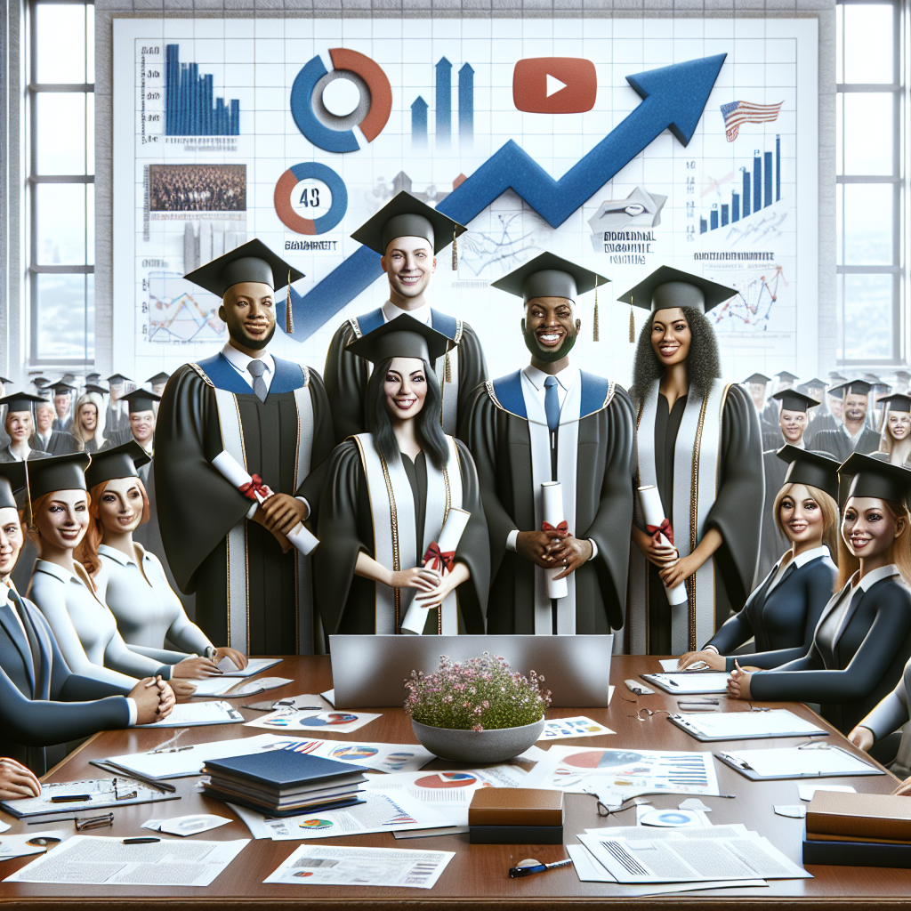 Prompt: Prompt: Generate an image in the style of photorealism depicting a vibrant government office. In the center, a row of proud graduates, adorned in cap and gown, holds their Master's degrees in Public Administration. They stand amidst a bustling atmosphere surrounded by charts and graphs illustrating the rising average number of comments on SmarterEveryDay's YouTube videos. Vibrant discussions fill the air as government officials and citizens engage in active dialogue, shaping new public discourse policies. The depiction should include only scenes, people, and objects, it should not include text or speech bubbles.