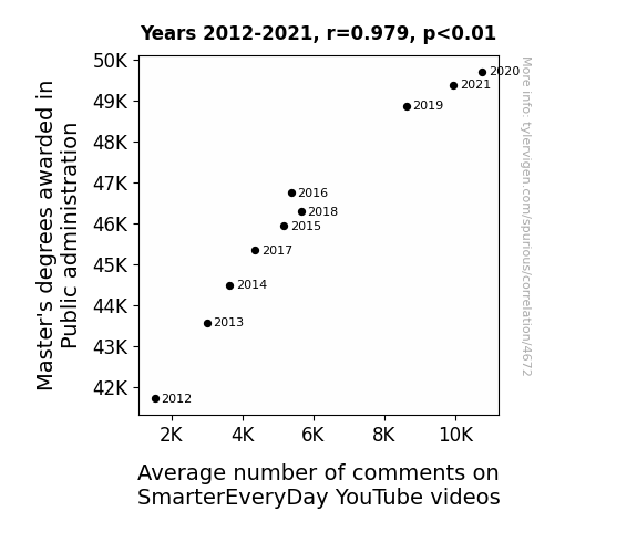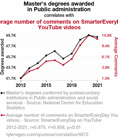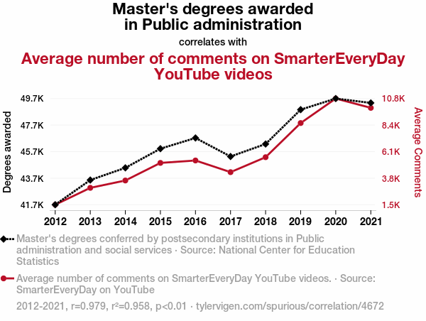 This means 95.8% of the change in the one variable (i.e., Average number of comments on SmarterEveryDay YouTube videos) is predictable based on the change in the other (i.e., Master's degrees awarded in Public administration) over the 10 years from 2012 through 2021.