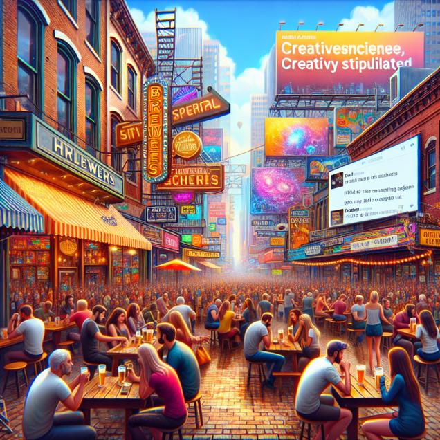 Prompt: Generative prompt for DALL·E-3: Generate an image in the style of a vibrant and dynamic magazine cover, reminiscent of TIME magazine. The scene depicts a bustling street in the United States, with colorful breweries lining the sidewalk. The air is rich with the aroma of freshly made hoppy and fizzy drinks. People are immersed in conversation, their faces animated with enthusiasm as they savor their beverages. In the background, a large screen displays Mark Rober's engaging YouTube videos, and a constant stream of comments reflects the heightened engagement from the creatively stimulated viewers. Create a visually compelling representation of this lively and bustling atmosphere, while keeping the depiction simple and without any text or speech bubbles. The depiction should include only scenes, people, and objects, it should not include text or speech bubbles.