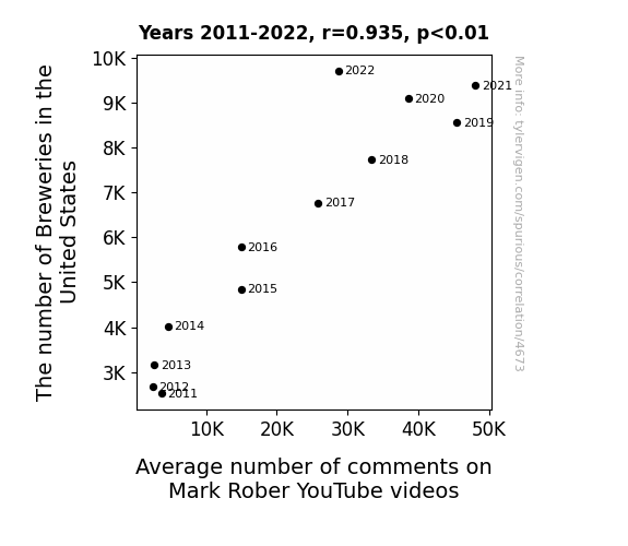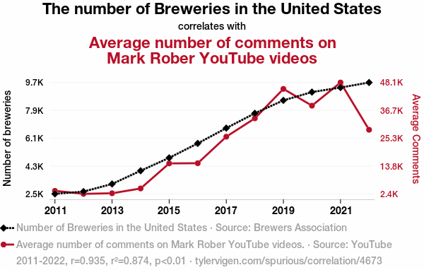 Your research team used data from Brewers Association and YouTube to assess this nagging question. You found a correlation coefficient of 0.9347448 and p < 0.01 for 2011 to 2022.